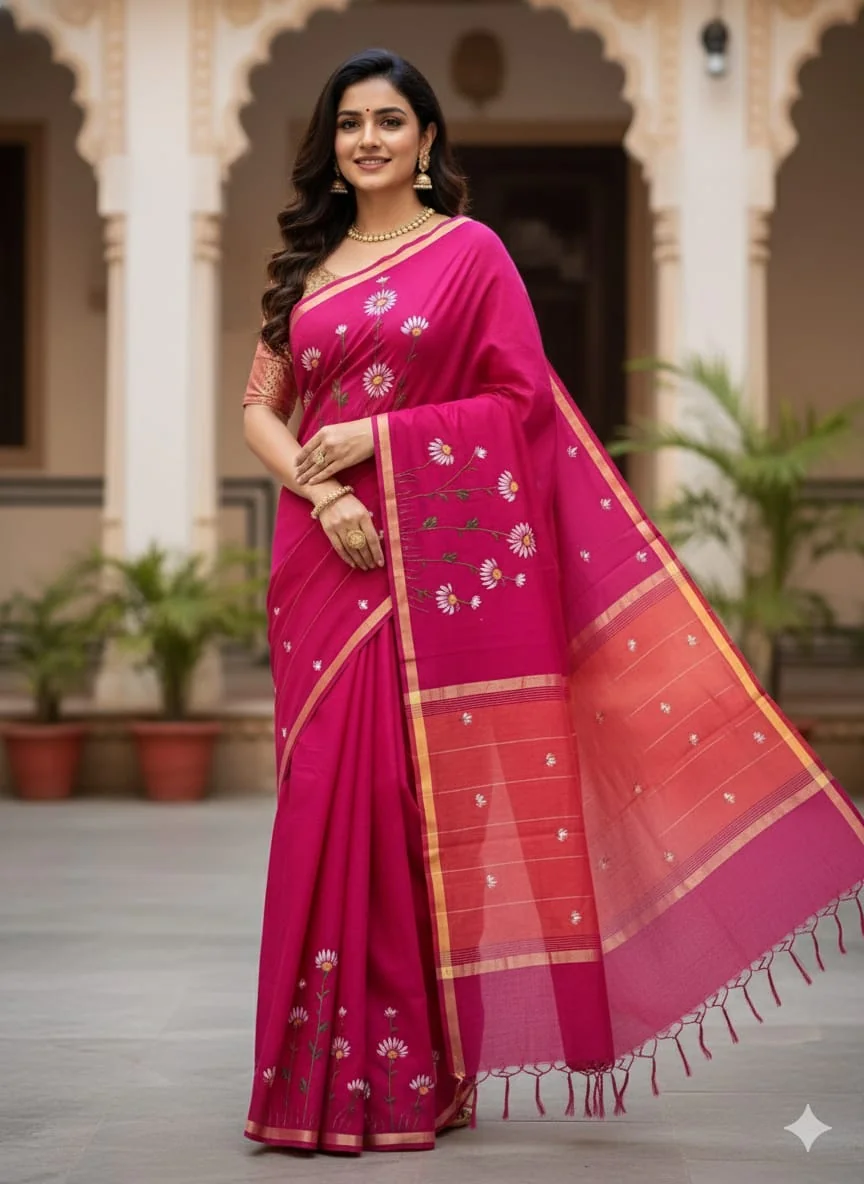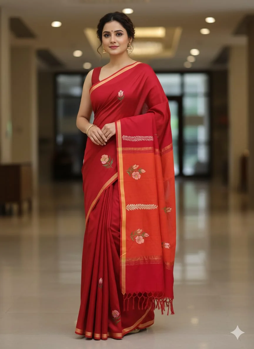 Product : Aari Saree Craft – Handwoven Material : 100% Cotton Yarn Size : 6.3 m (5.5 m Saree + 80 cm Blouse ) Color – Red Quantity – 1 Washing & Care/Maintenance -Gentle hand wash and do not dry in strong sunlight. These are handmade products hence irregularities are unique to these products. Actual color of the product may slightly vary from the color in the image due to variation in on-screen settings. Non-violent fabric (Mutton tallow not used in sizing process) Healthy fabric Nature friendly as it is 100% cotton